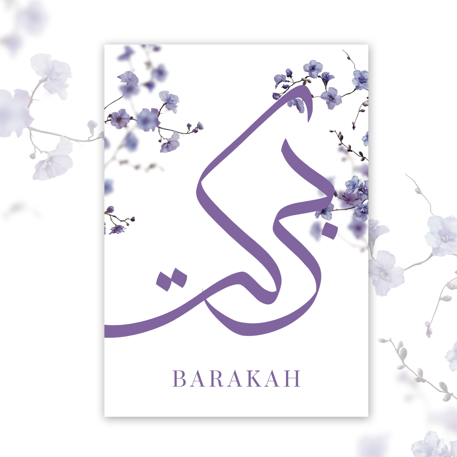 Barakah (blessings) in graceful calligraphy, surrounded by delicate floral accents. Combination of soft pastel hues & intricate floral patterns.