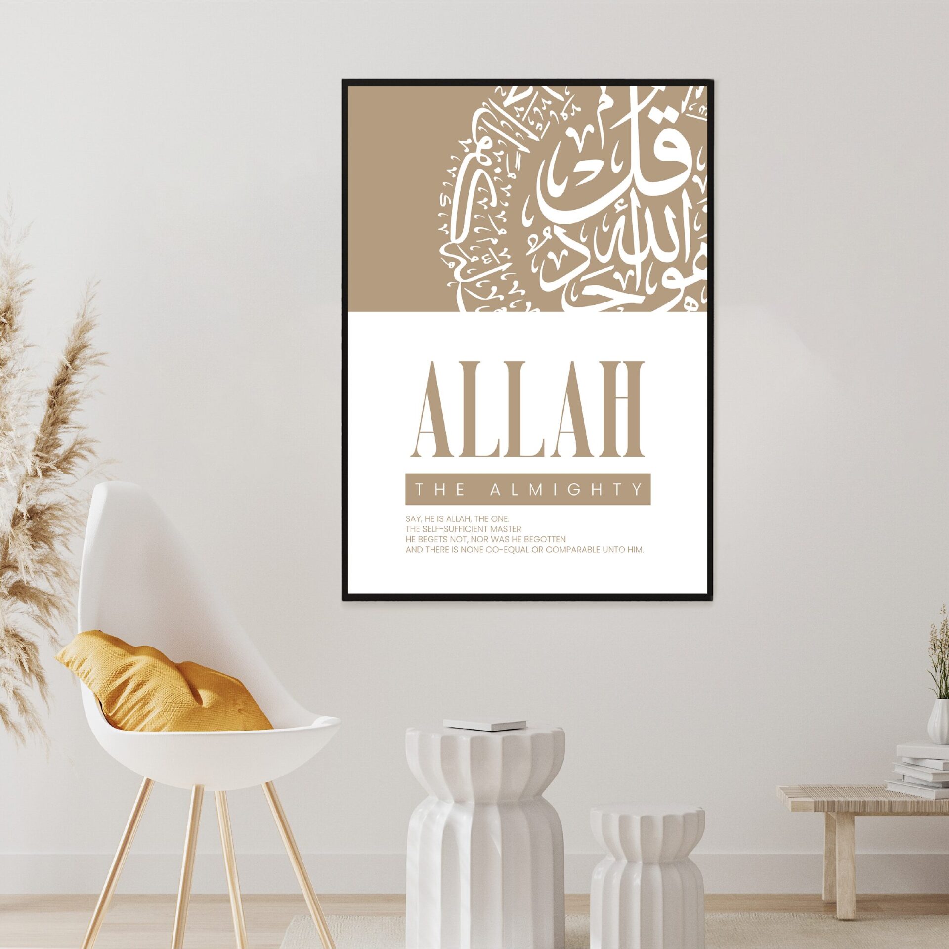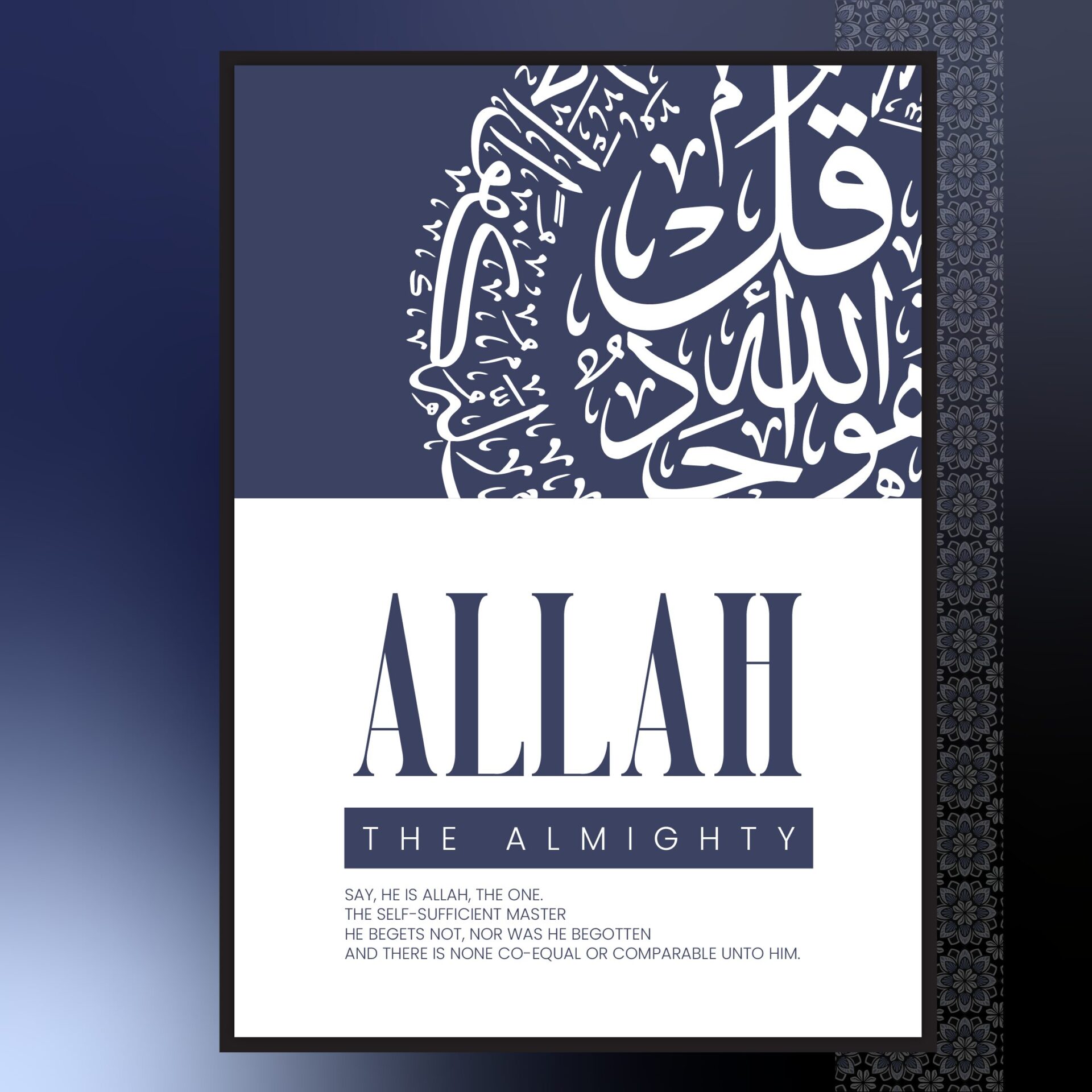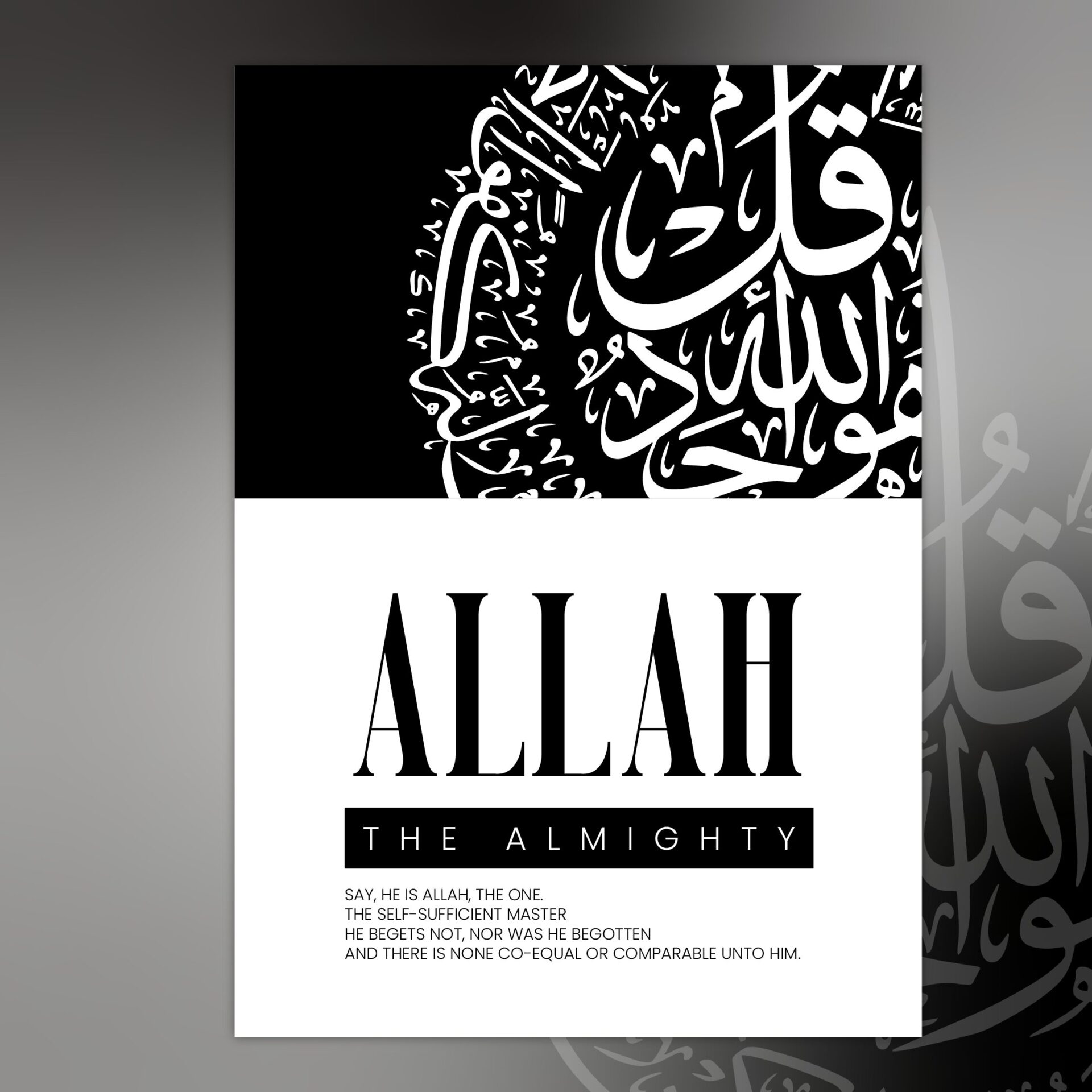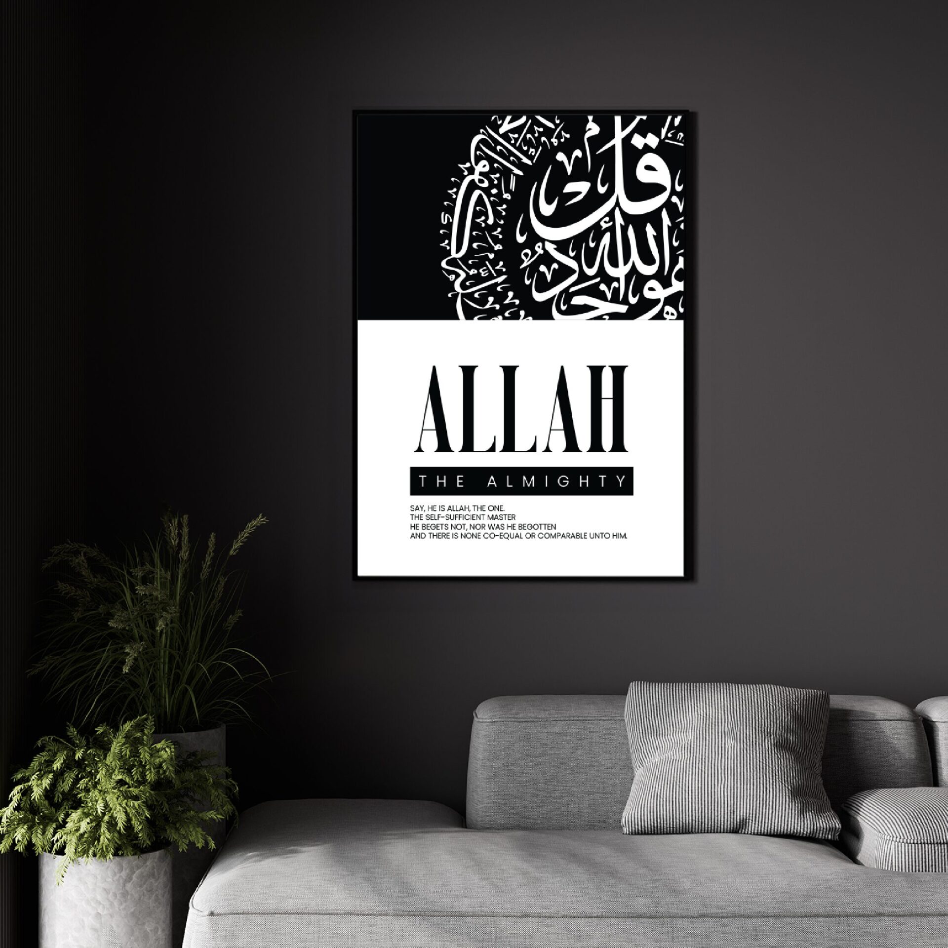 This modern Islamic art print beautifully captures Surah Ikhlas, a central chapter in the Quran that reflects the oneness of Allah. With its clean design and impactful Arabic calligraphy, this artwork adds spiritual depth and elegance to any space. Its contemporary appeal and timeless message make it a perfect addition to modern homes, prayer rooms, or offices.