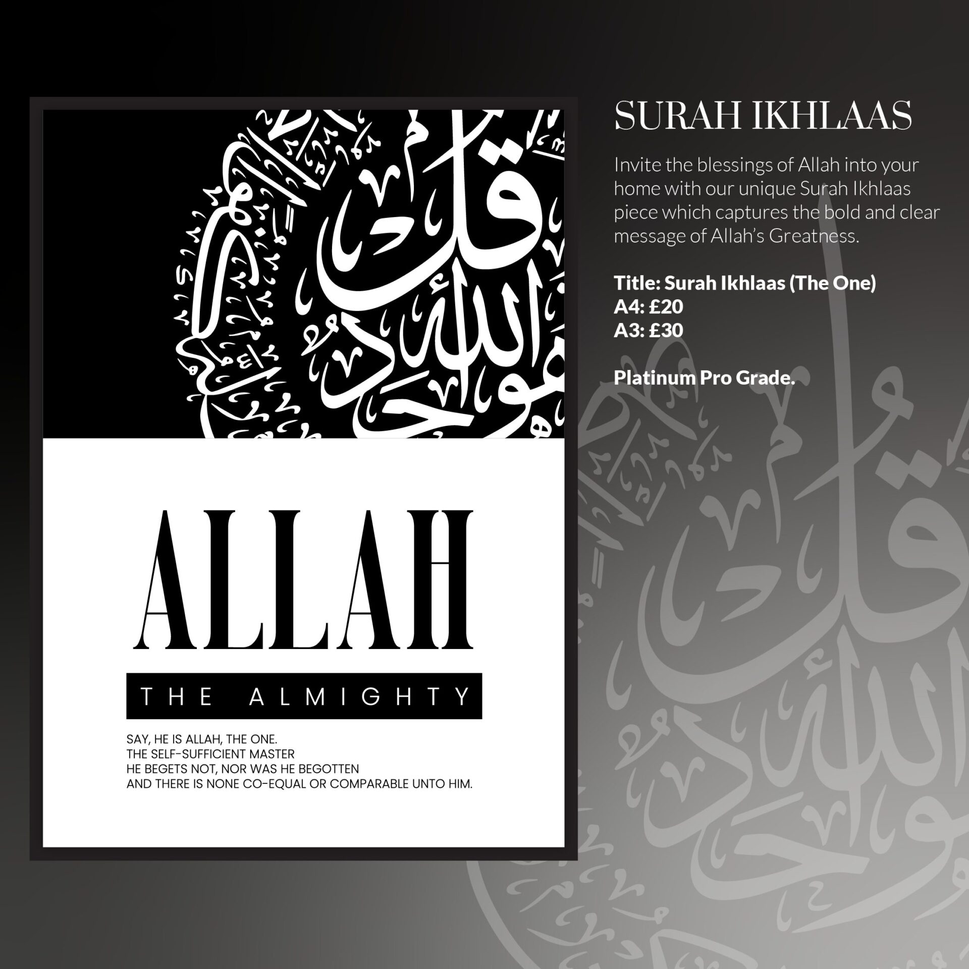 Surah Ikhlas holds immense significance in Islam, encapsulating the essence of Tawheed – the oneness of Allah. This modern Islamic art print brings that powerful message into your daily life through beautifully crafted Arabic calligraphy. Every line symbolises purity, clarity, and unwavering faith in the divine.