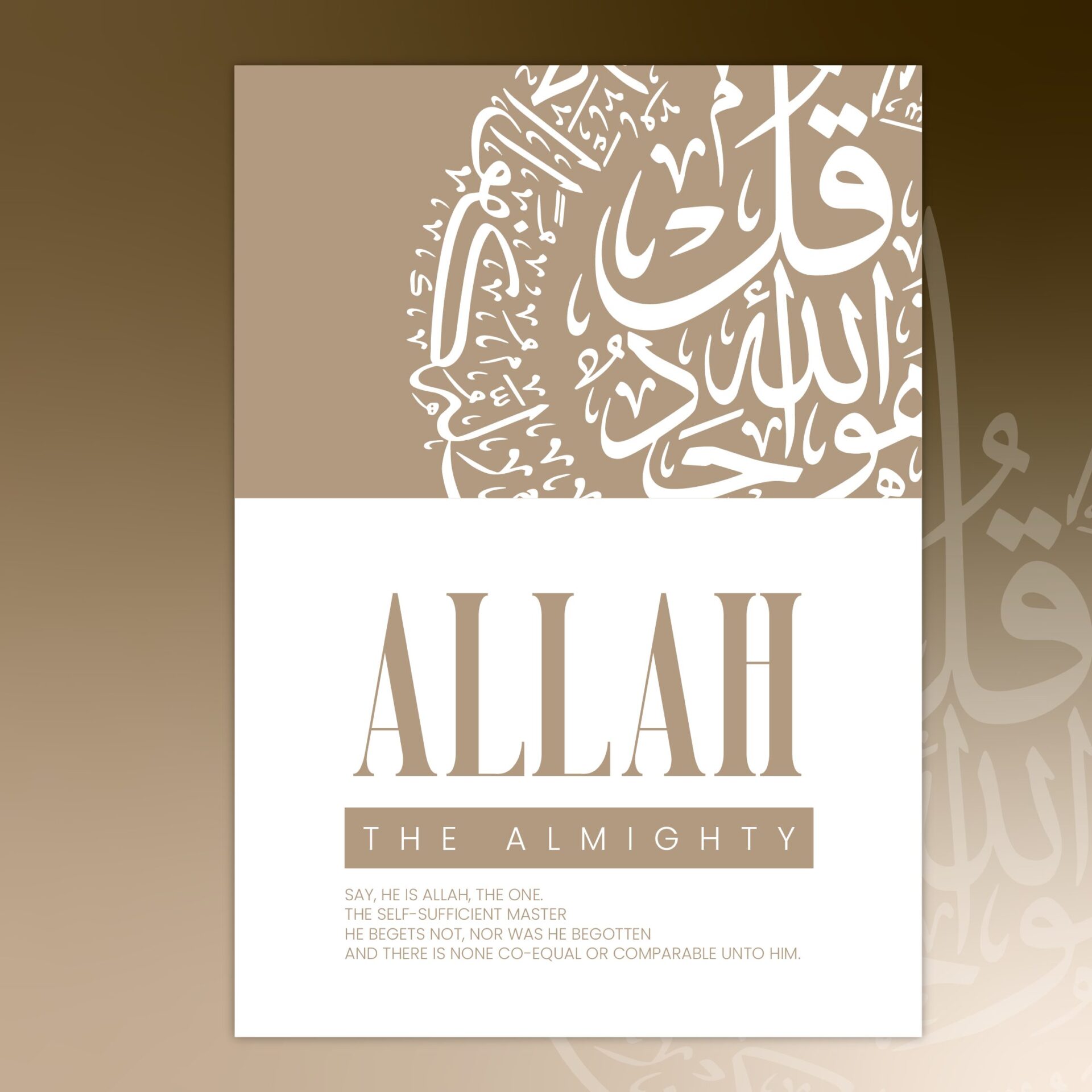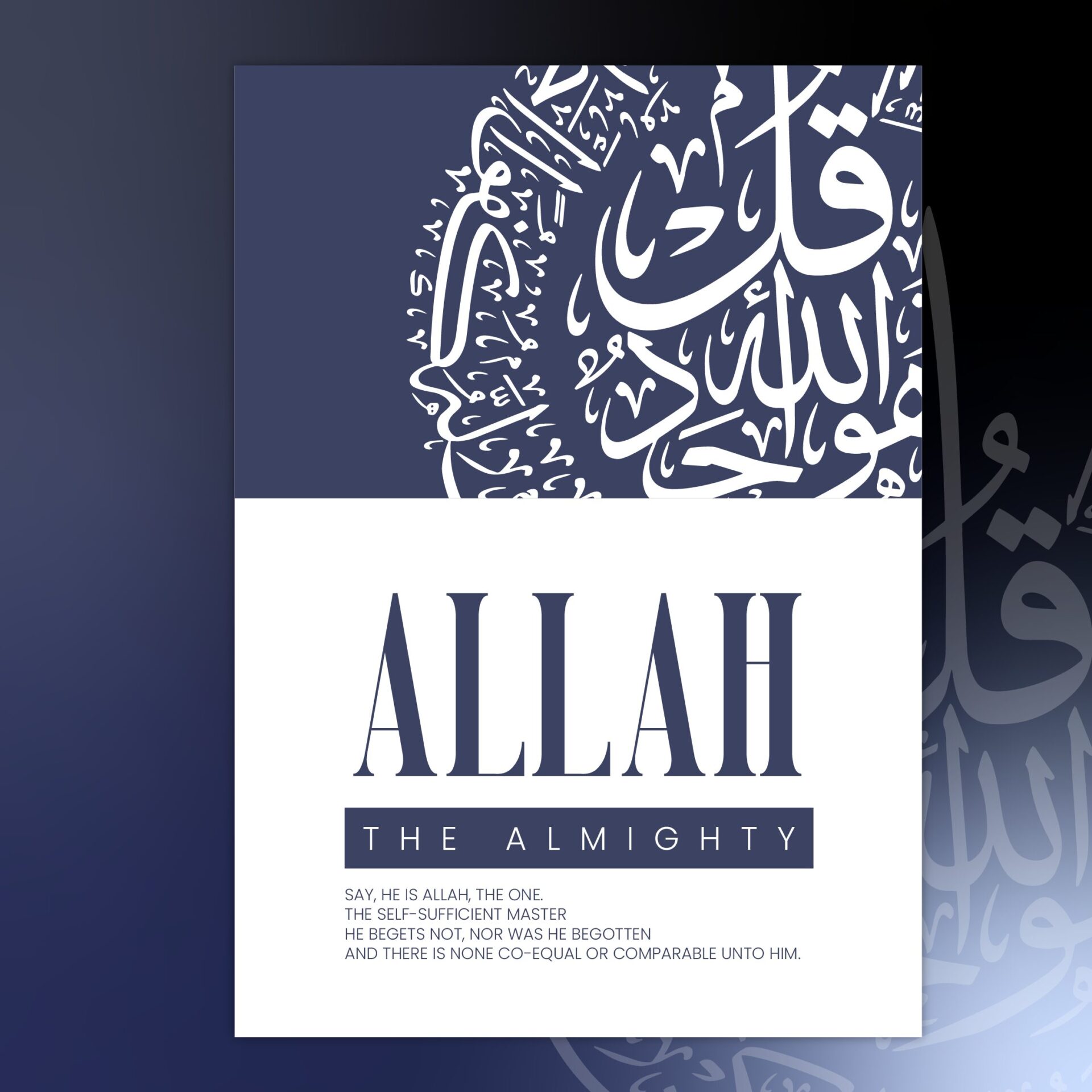 Below the word “Allah,” you’ll find the English translation of Surah Ikhlas, reminding us of the divine qualities of Allah: