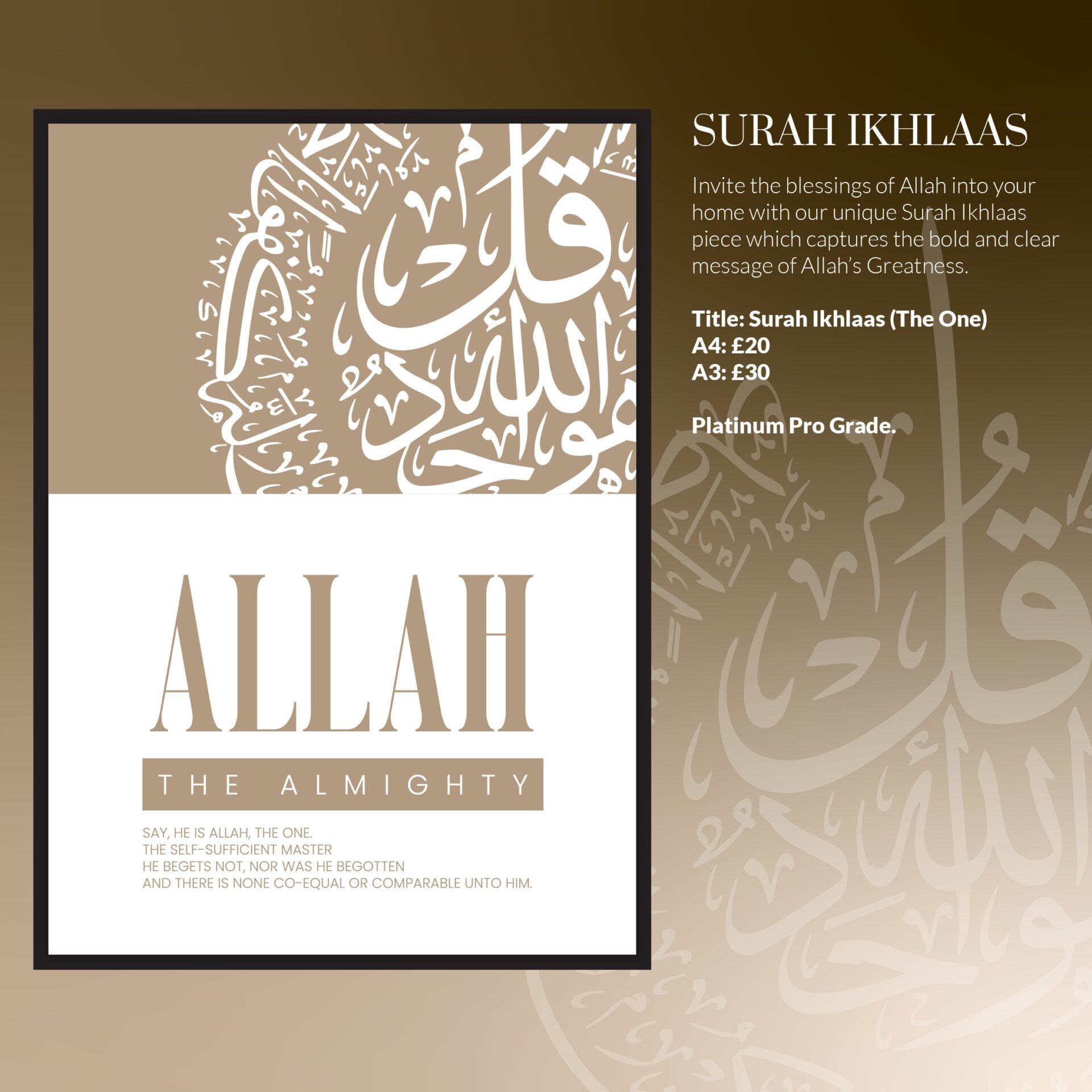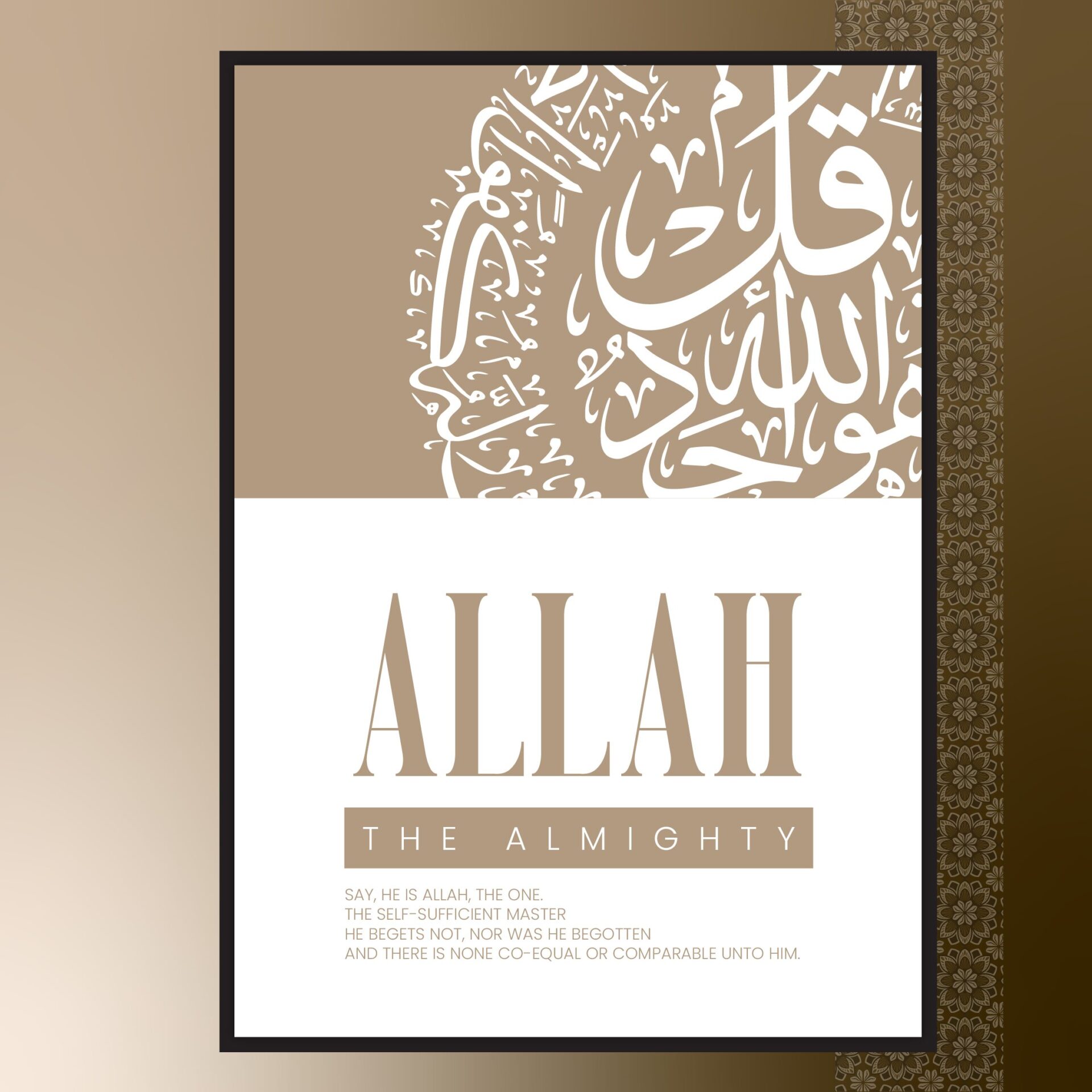 The focus of this stunning piece is the exquisite Arabic calligraphy, designed to honour Surah Ikhlas and its profound message. Flowing calligraphic strokes balance simplicity with sophistication, ensuring the viewer feels connected to its meaning. The blend of classic artistry with a modern presentation enhances accessibility for those seeking faith-inspired decor.