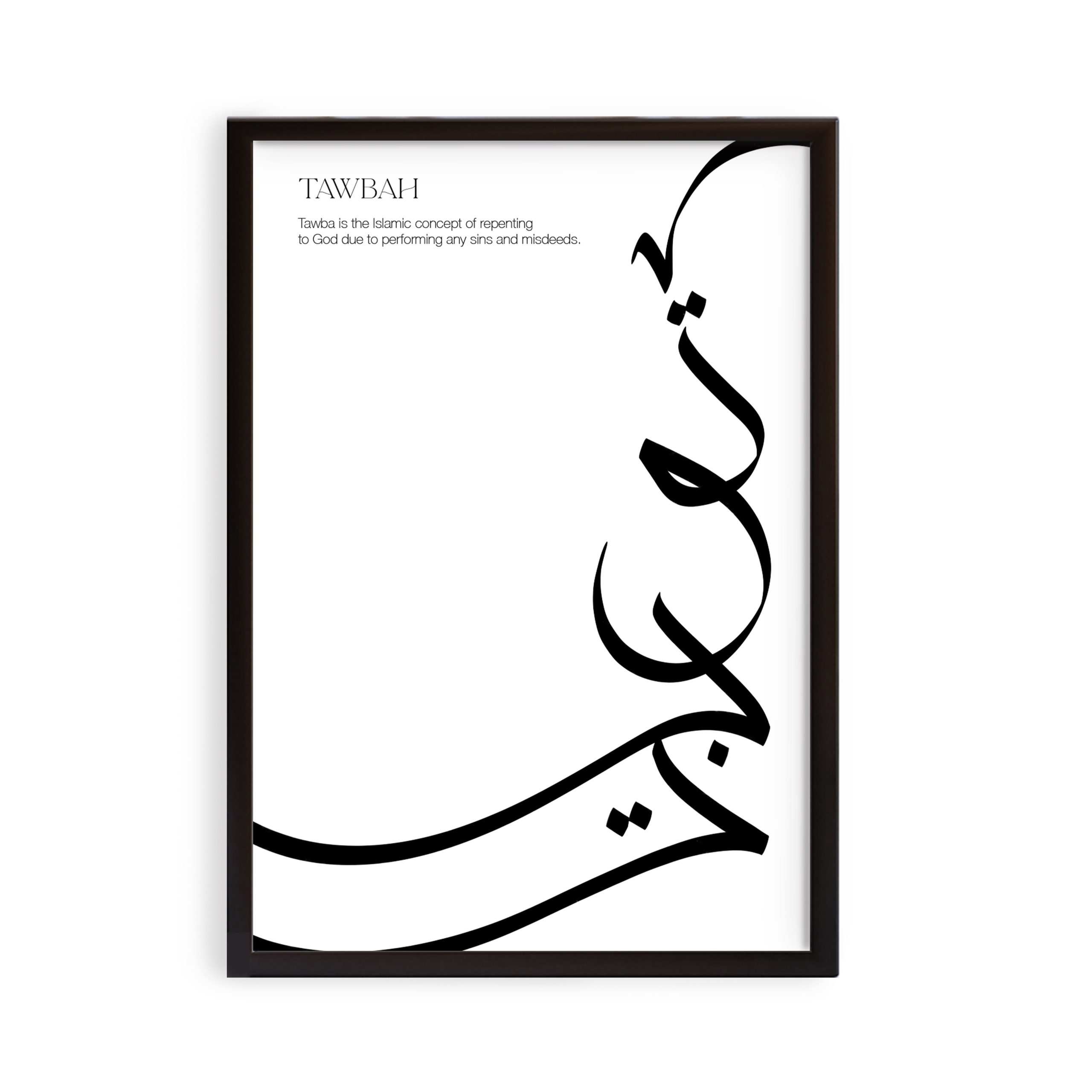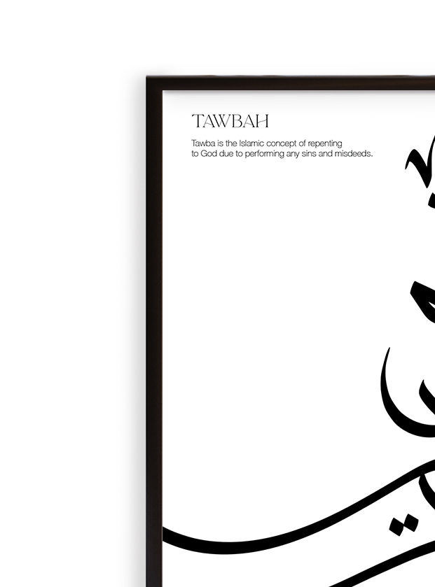 Tawbah holds profound significance in Islam, representing the process of seeking forgiveness and returning to Allah with sincerity. This modern Islamic art print encapsulates this spiritual journey through beautifully crafted Arabic calligraphy, symbolizing hope, renewal, and divine mercy.